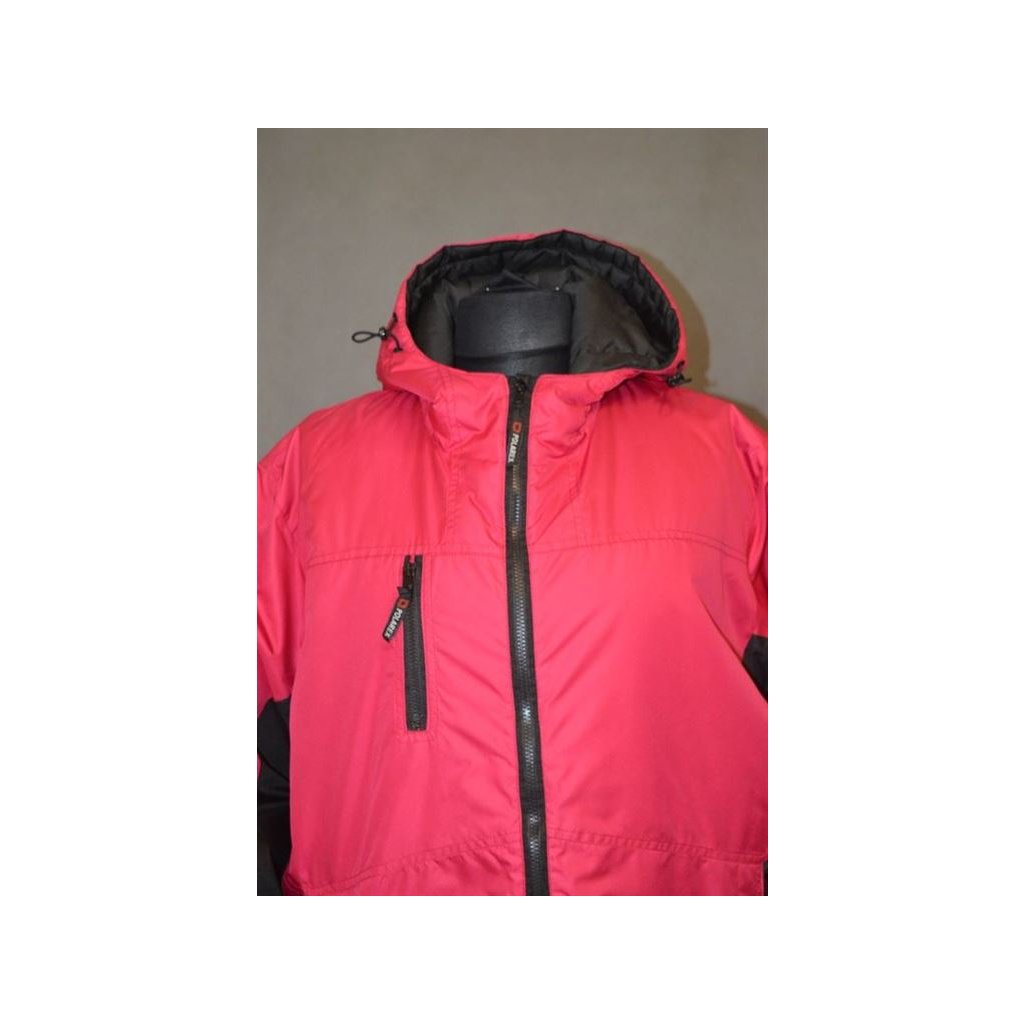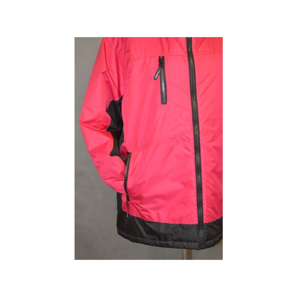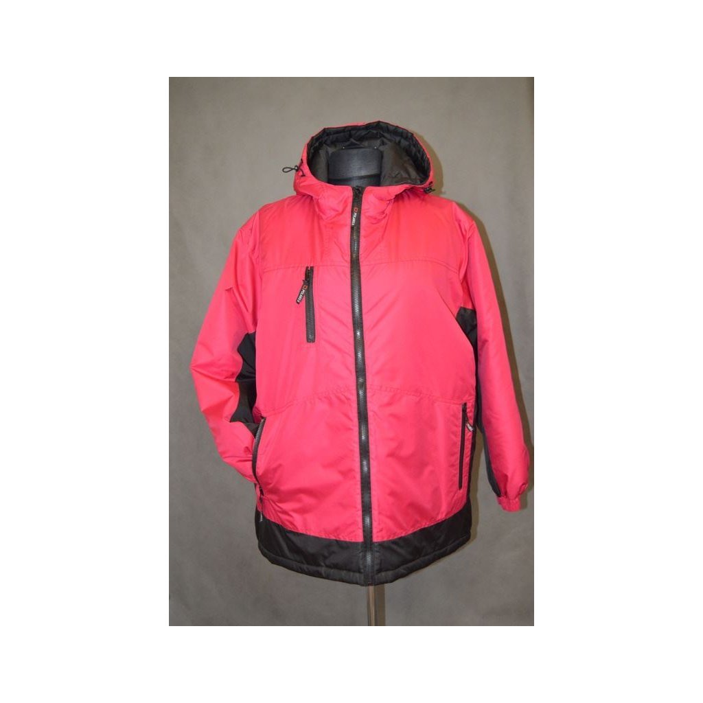 Dámská zimní bunda s kapucí -fuksiovo-černá - zapínání na zip, rukávy do gumy, všité kapsy na zip + náprsní kapsa na předním díle také na zip, dole šňůrka na stažení - obvod hrudníku: 146 cm