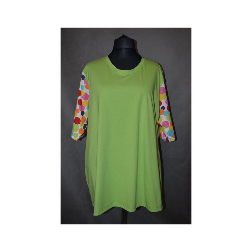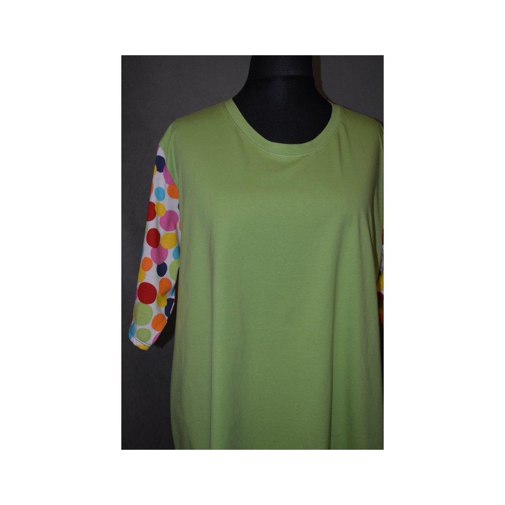 Triko-halena zelenkavá s barevnými puntíky na rukávech, kr. rukáv, kulatý výstřih - hodí se na léto k bílým legínám - obvod hrudníku: 130 - 200 cm