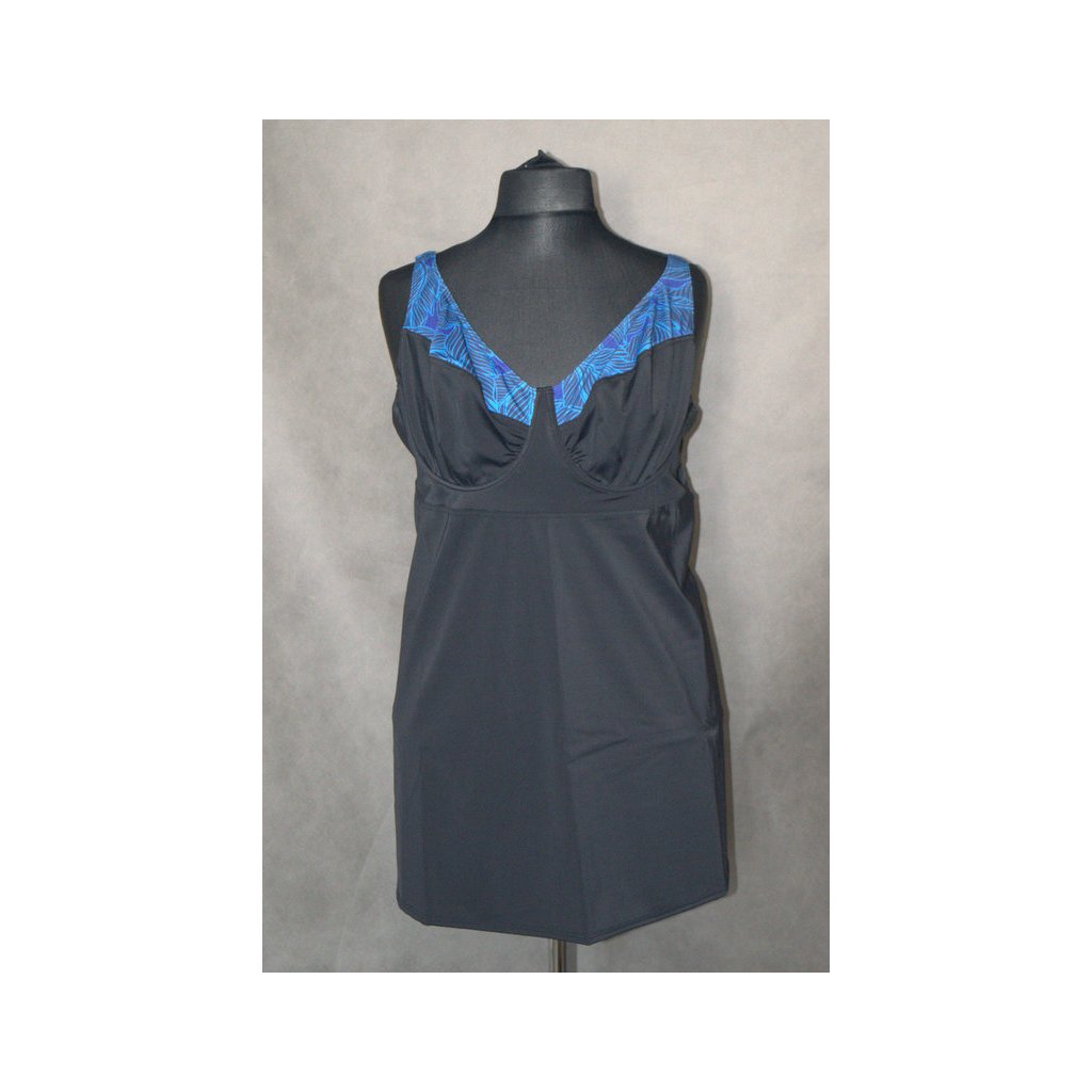 Plavky Tankiny, (dvoudílné plavky) vrchní díl do úrovně boků, podprsenka do kostice, širší posunovací ramínka, kalhotky vyšší černé jednobarevné, barva vrch. dílu: černá - s modrým vzorem