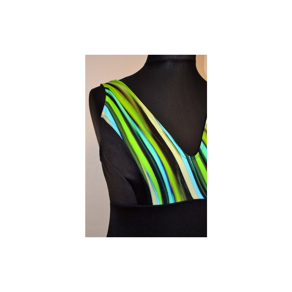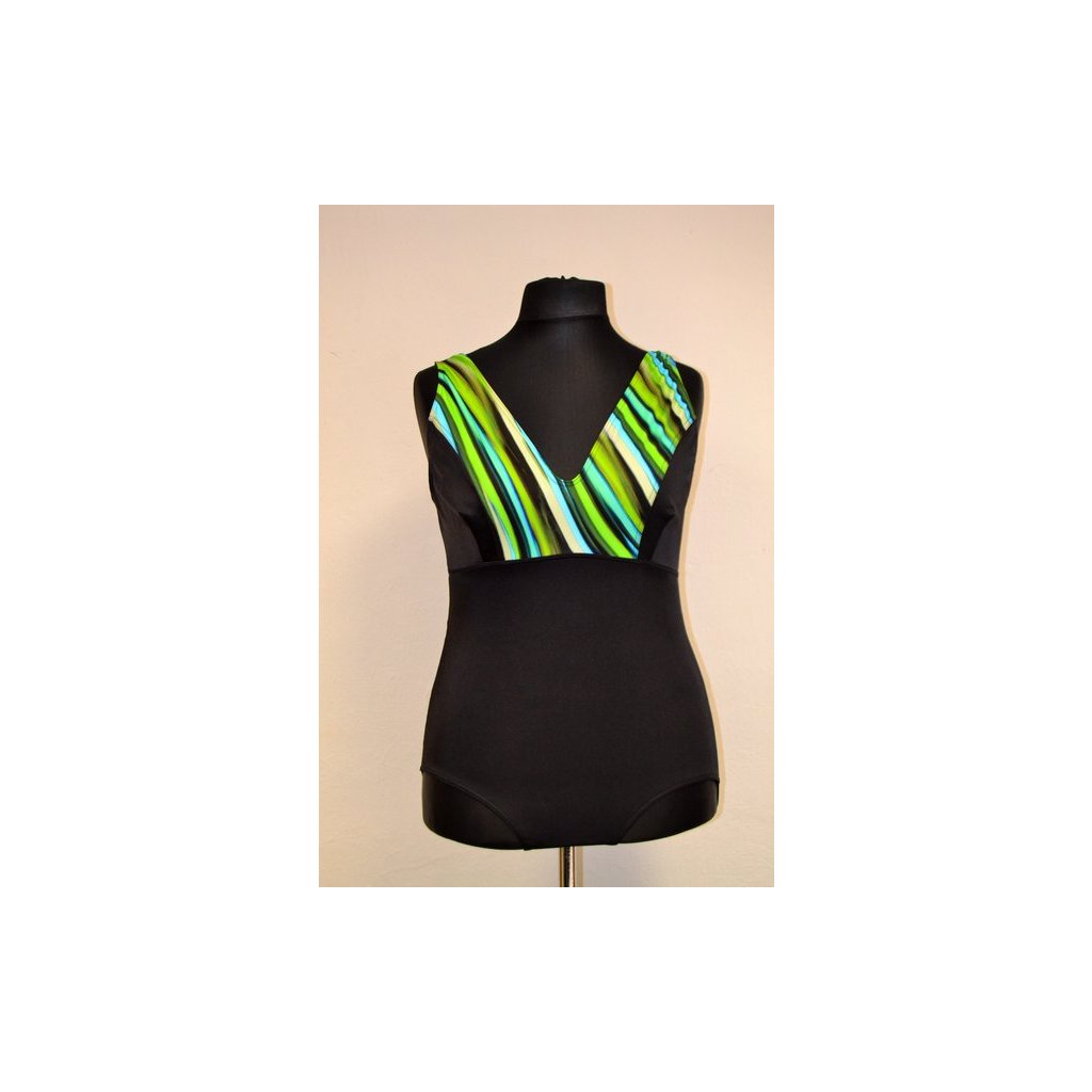 Dámské plavky jednodílné černé se zeleno-modrým vzorem, přestřižené pod prsy, podšitý přední díl, širší ramínka - vel. 56