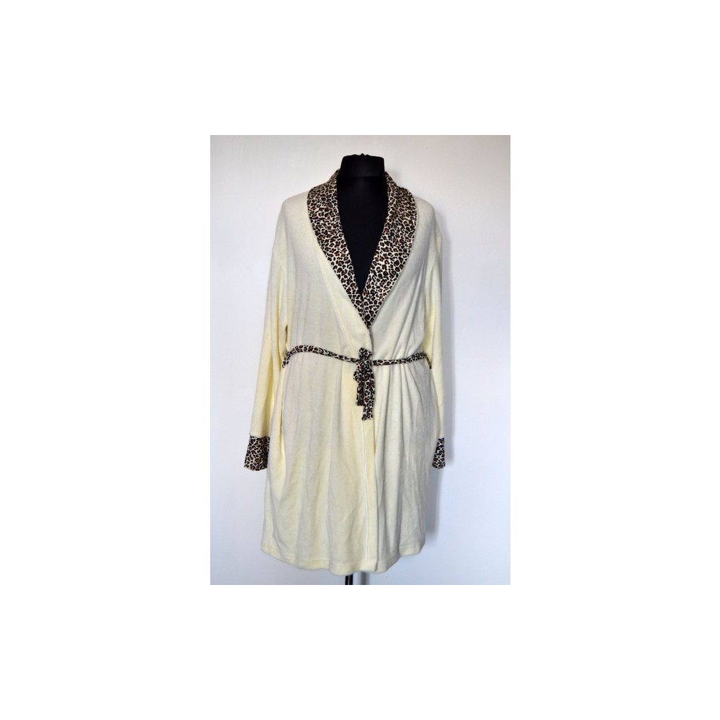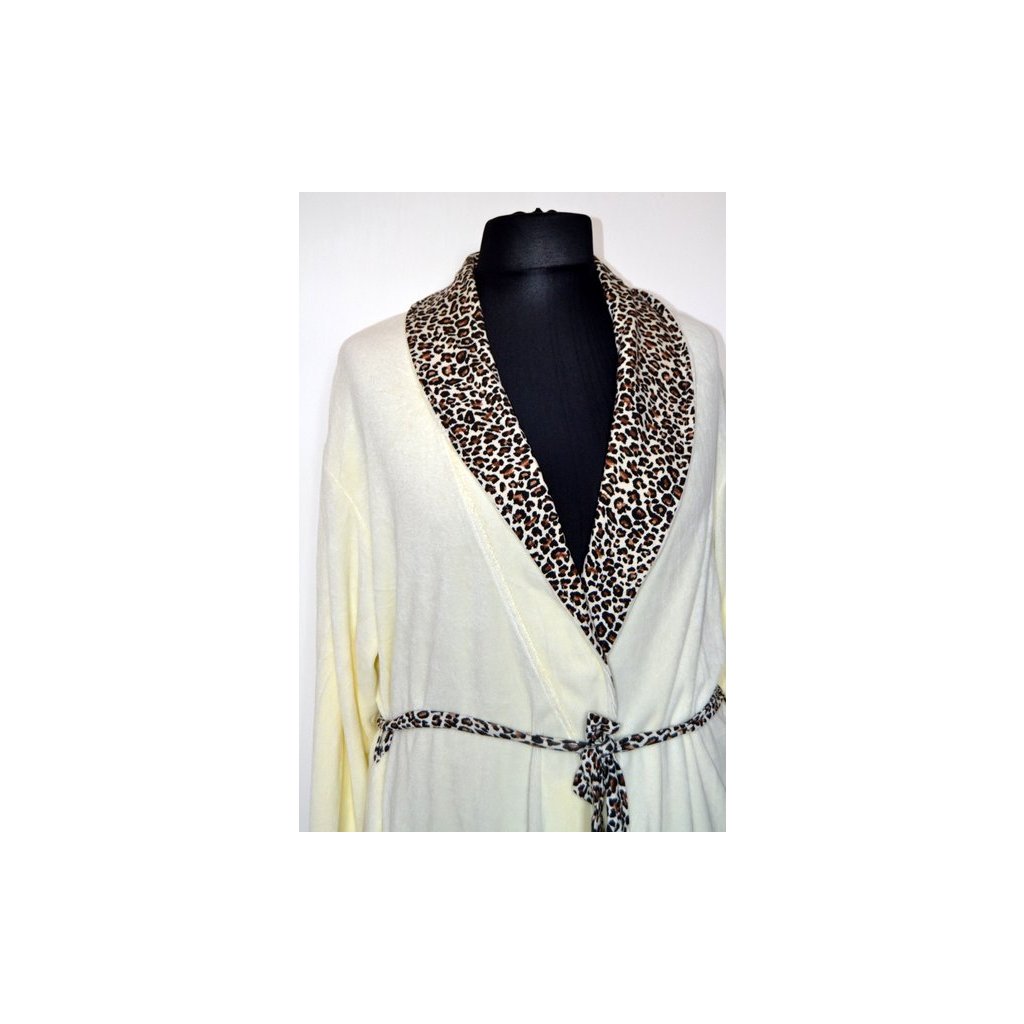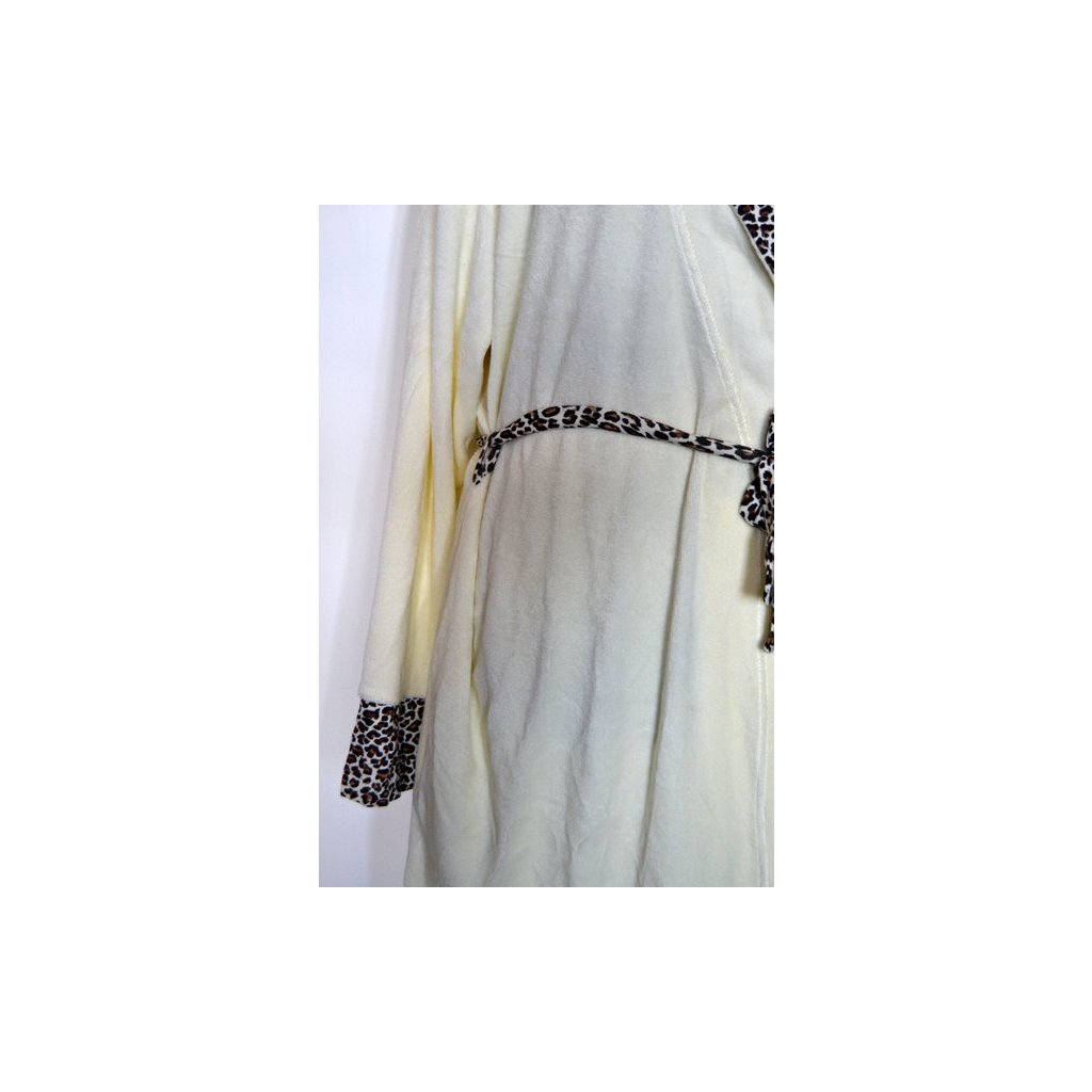 Luxusní frote smetanový župan, zavazovací přes sebe, šálový límec, na límci a na rukávech leopardí vzor, všité kapsy - vel. XL