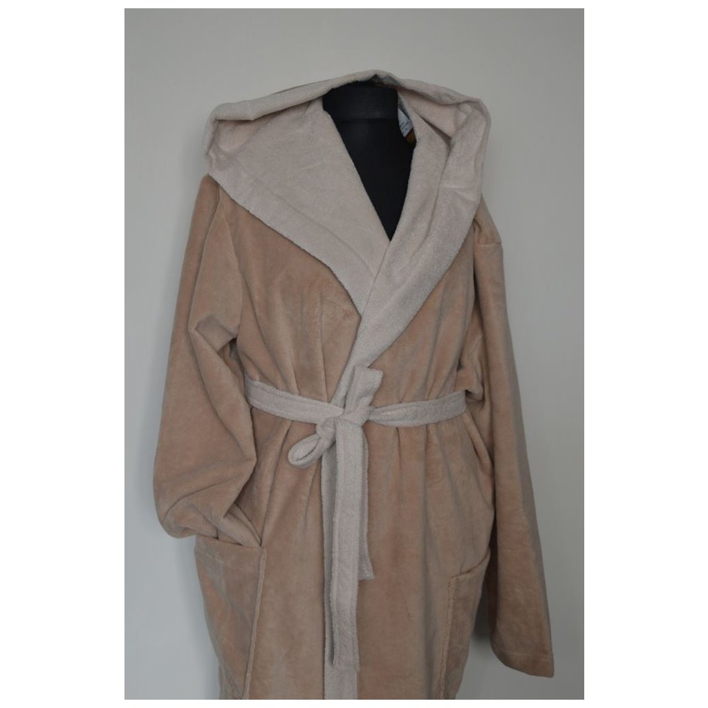 Dámský dlouhý župan s kapucí, barva: latte, zavazovací přes sebe, kapsy, vnitřní bavlněná smyčka zajišťuje skvělé osušení a příjemný tepelný komfort,