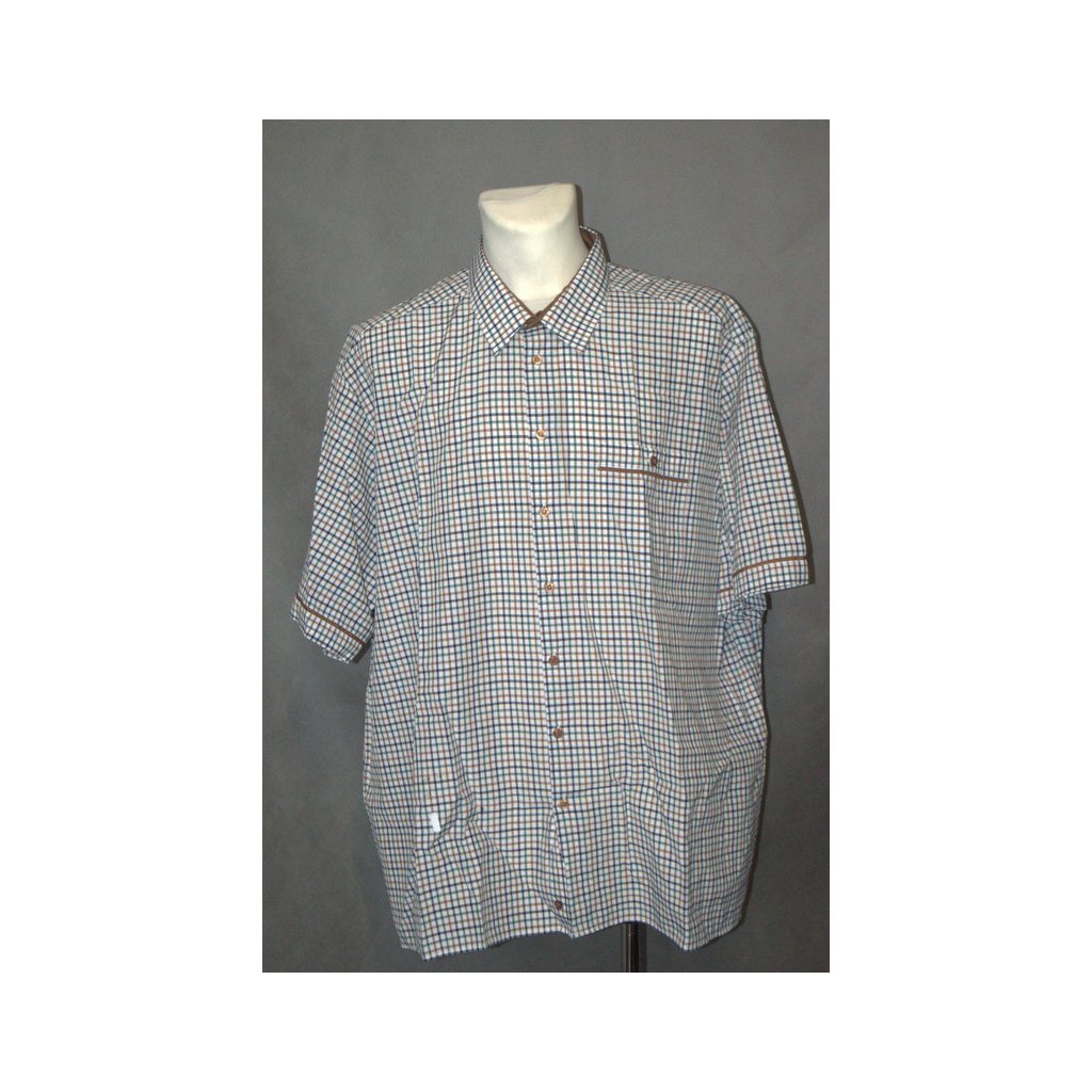 Košile pánská sportovní, kr. rukáv, kapsička - vel. 50 barva cihlovo-hnědo - bílou kostičkou, košile má kaz (řídká látka), košili doporučujeme na doma - kaz je vyfocený a je v dolní části košile , material 70% bavlna,30% polyester