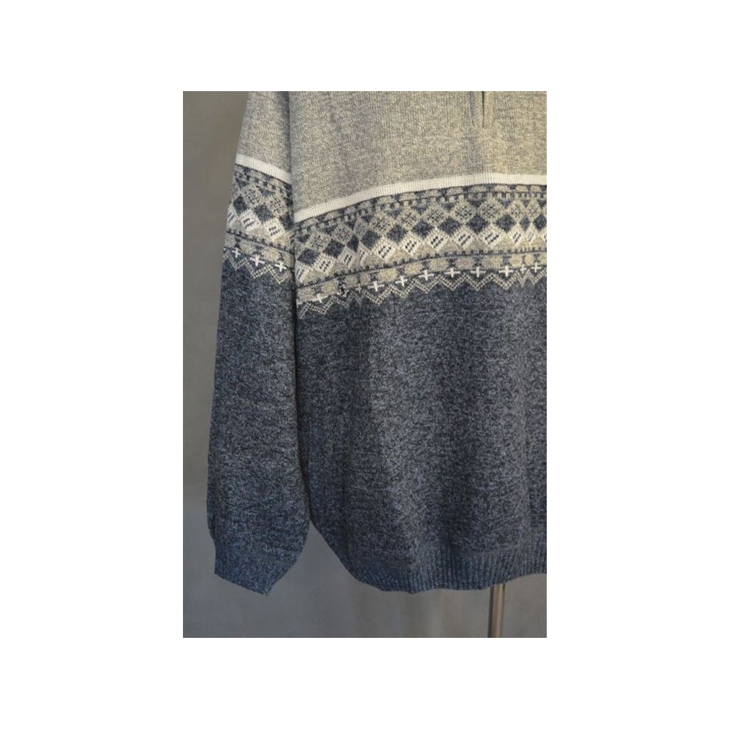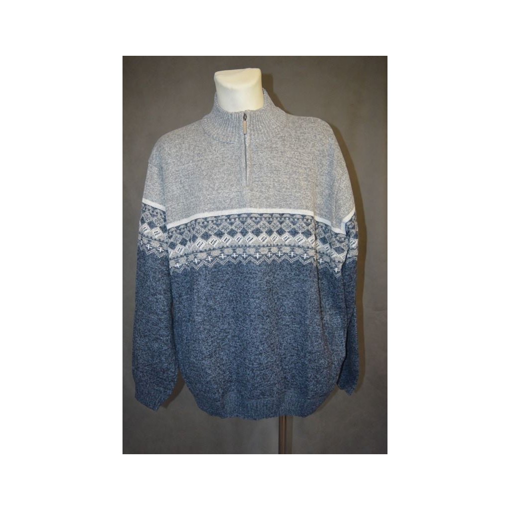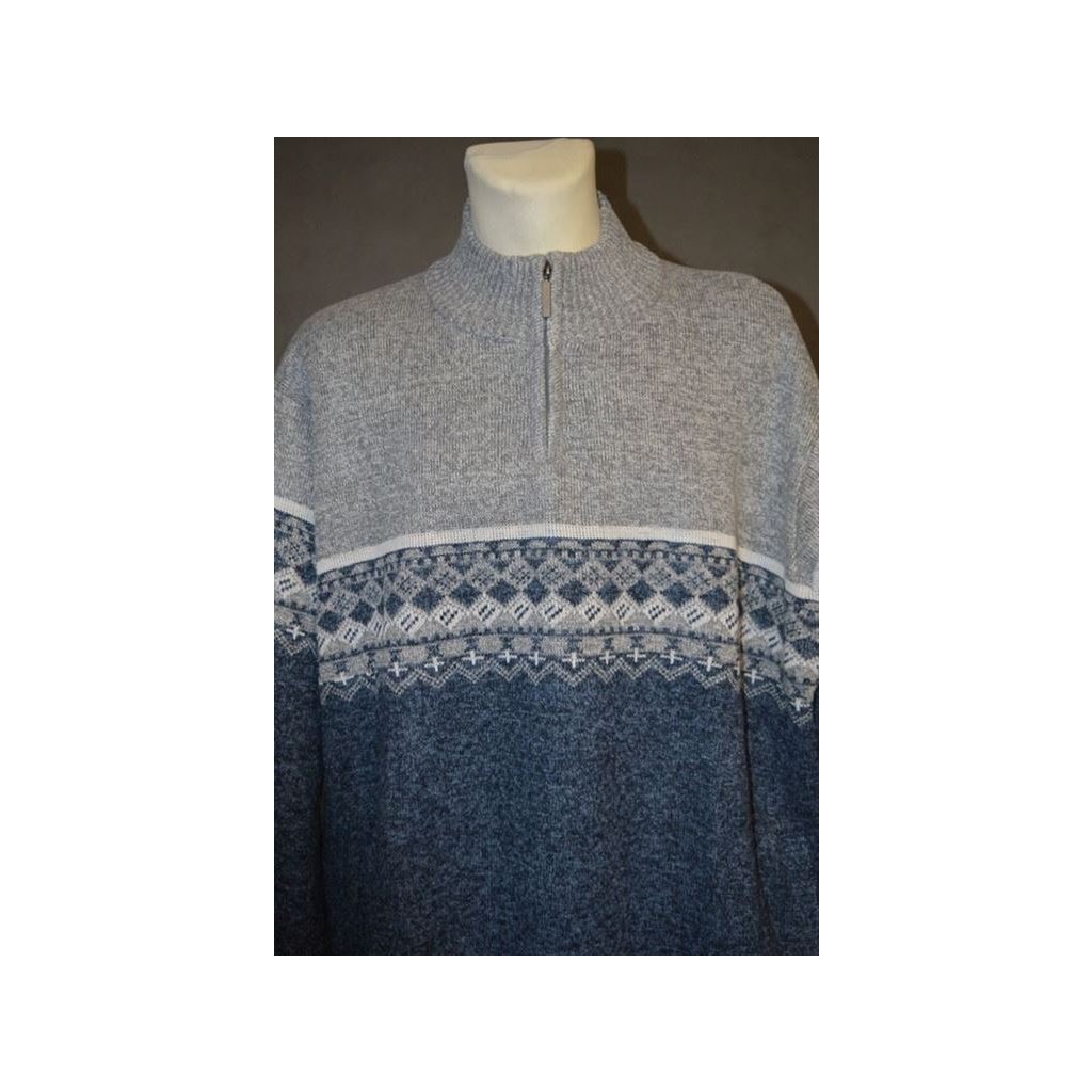 teplý svetr na kr. zip, rukávy a dolní část do patentu, barva odstíny šedé a modré, 100% akryl (uvnitř flanel), v dolní části kapsy