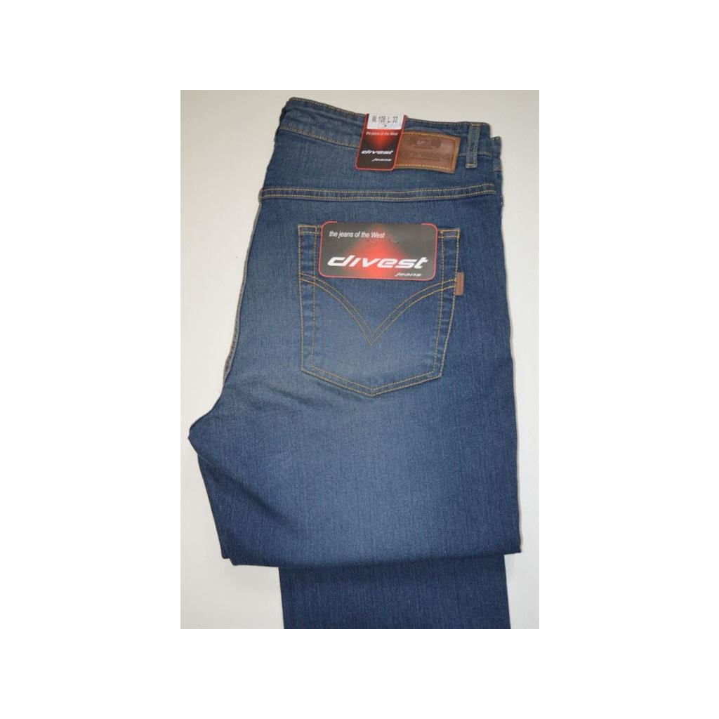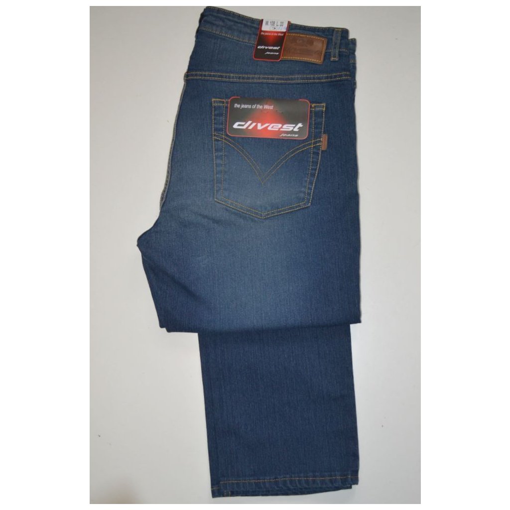 Středně modré, mírně šoupané, moderní rifle, pevný pas - obvod pasu: 108 - 140 cm