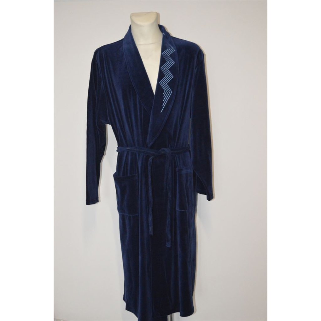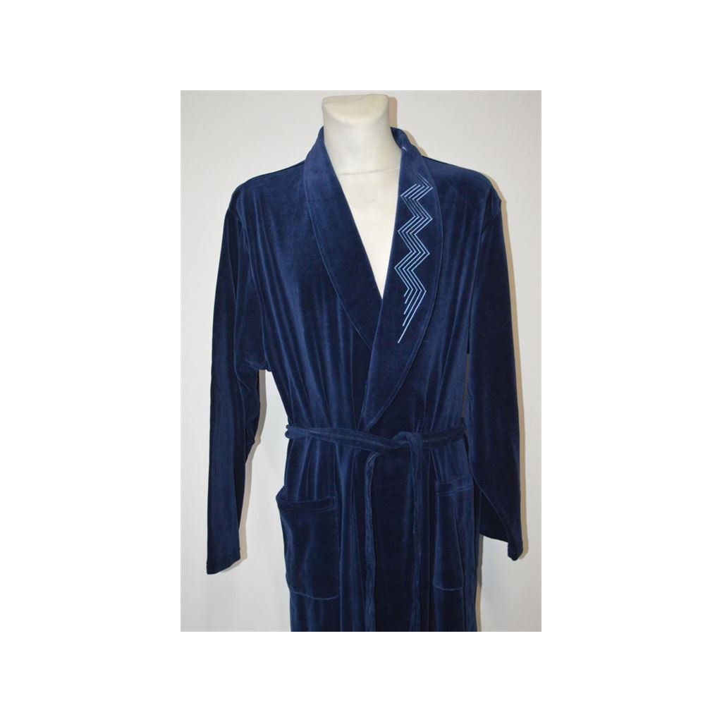 pánský sametový župan , šálový límec, tm. modrý s výšivkou, na zavazování, kapsy, materiál 100% PES