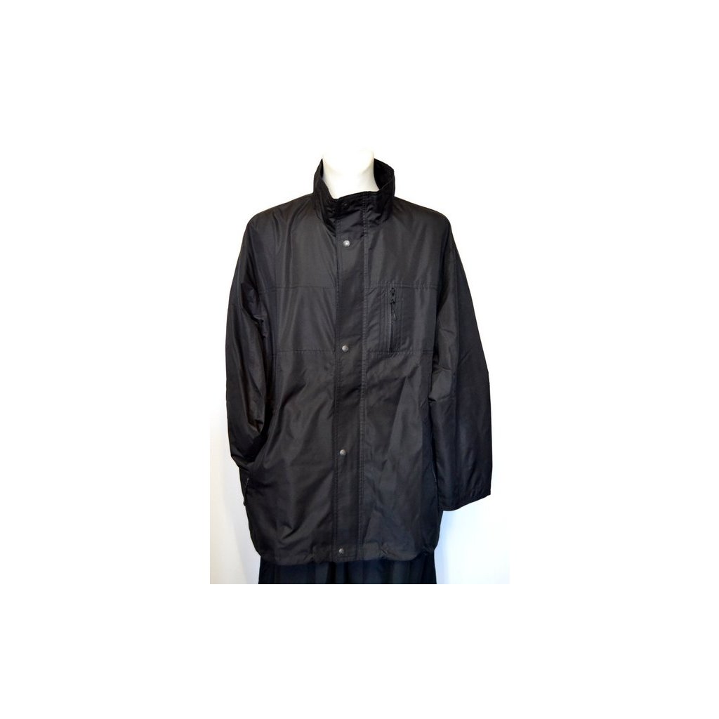 Jarní pánská černá bunda s podšívkou, zapínání na zip a cvoky, na předních dílech všité kapsy na zip, vnitřní náprsní kapsa na zip, dole šňůrka na stažení - obvod hrudníku: 144, 174 cm