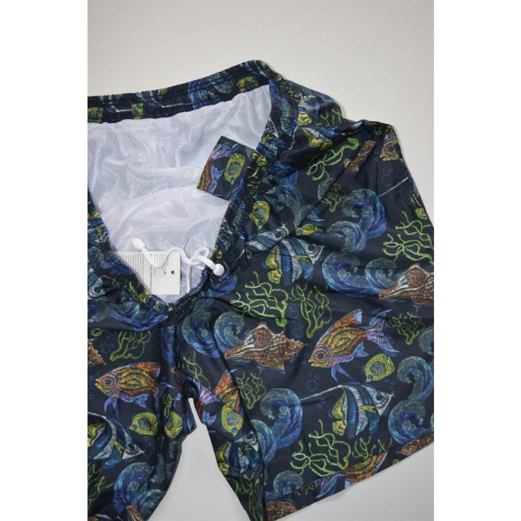 Kraťasy - koupačky- tmavý černo-modro-zelený potisk, vnitřní slipy s vnitřní kapsičkou na suchý zip, na př. díle dvě vnitřní kapsy, v pase guma a šňůrka na stažení, 100% polyester - rychleschnoucí material