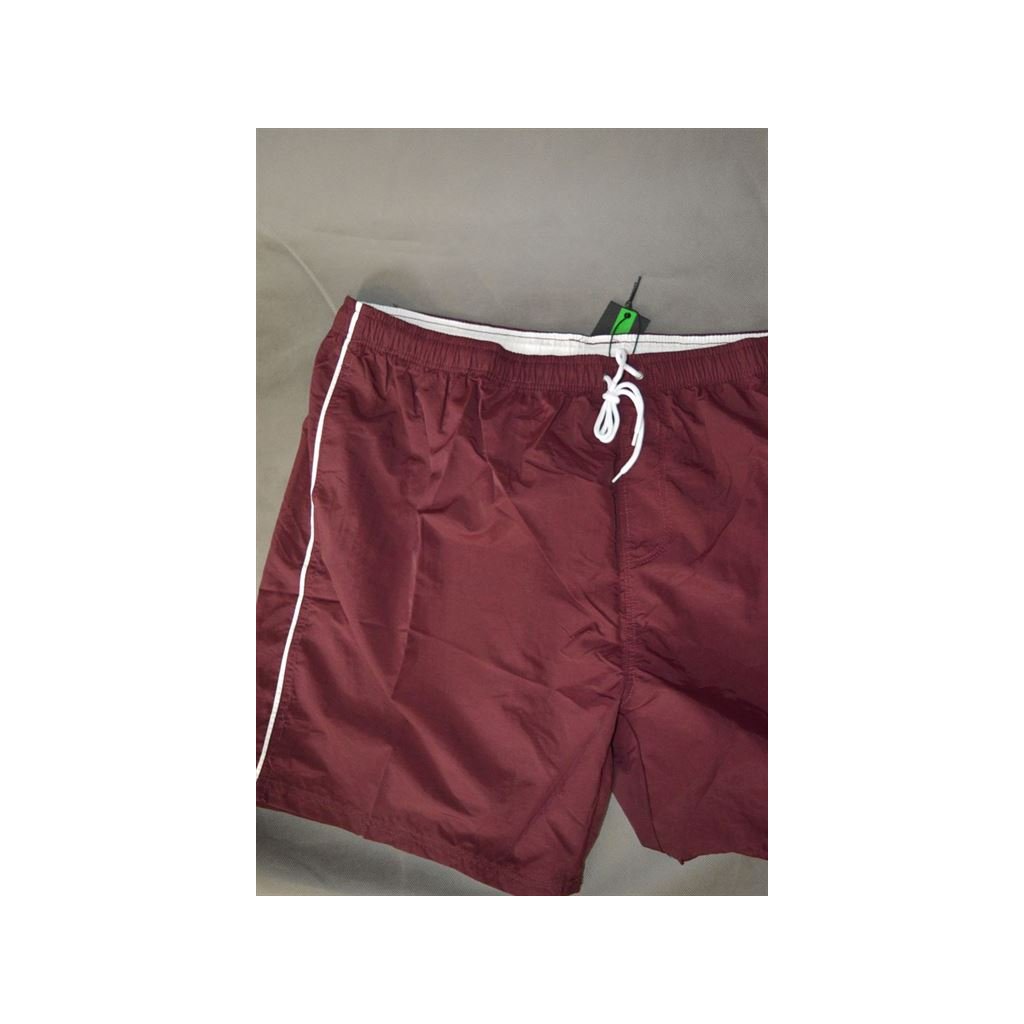 Koupací šortky z rychleschnoucího materiálu . Uvnitř siťkové slipy. V pase prošitá široká guma se šňůrkou pro snadnou regulaci stažení. V bočních švech všité kapsy, na zadním dílle našitá kapsa na suchý zip, uvnitř malá síťovaná kapsička, barva bordo, materiál. 100% nylon
